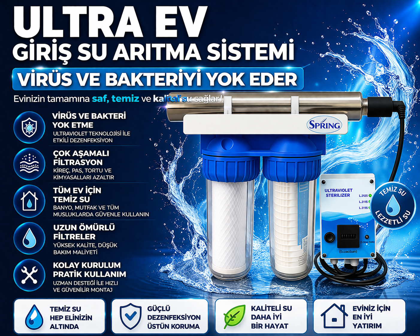 Ultra ev ana giriş su arıtma sistemi, şebekeden gelen suyun eve giriş noktasında filtrelenmesini sağlayan merkezi bir arıtma çözümüdür. Bu sistemler sayesinde yalnızca içme suyu değil, evde kullanılan tüm su (mutfak, banyo, çamaşır, kombi vb.) arıtılmış olur. Böylece hem kullanıcı sağlığı hem de tesisat sistemleri koruma altına alınır.